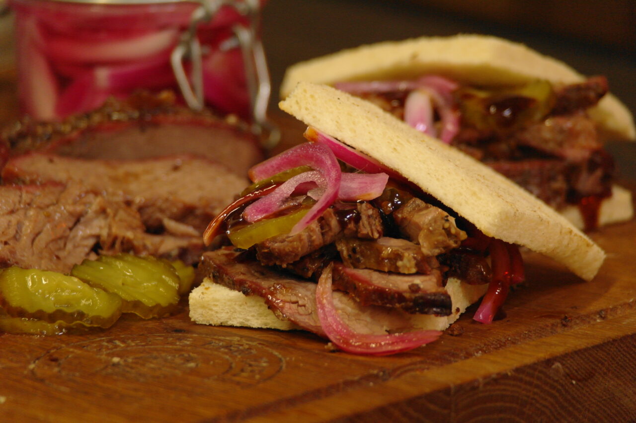 Dit gerecht ken ik nog niet zo heel lang, maar staat wel met stip boven aan. Het gaat ome en low&slow bereidde Vacio Tierno. Dit is een Argentijnse cut die bestaat uit een stuk bavette vinklap en bavette maanvlees. Ik doe er niet te veel kruiden op, alleen wat SPG. Bij de Vacio serveer ik broodjes, augurk en zoetzure rode ui.