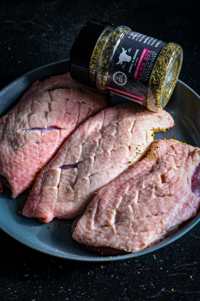 Dat hoeft niet. De natuurlijke vetlaag zorgt al voor veel smaak. Wil je extra aroma, gebruik dan een droge rub of lichte marinade.