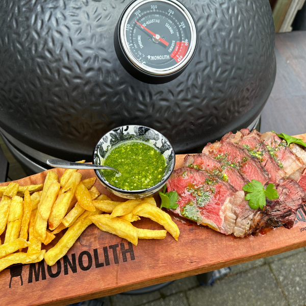 In dit Angus côte de boeuf recept met peterselie knoflookboter gebruik we de angus côte de boeuf. Dit is een prachtig gemarmerd stuk rundvlees. Het vlees zelf heeft eigenlijk niet zo veel nodig behalve een mooie garing op de BBQ. Bij de côte de boeuf serveren we een (platte) peterselie knoflookolie en frietjes.