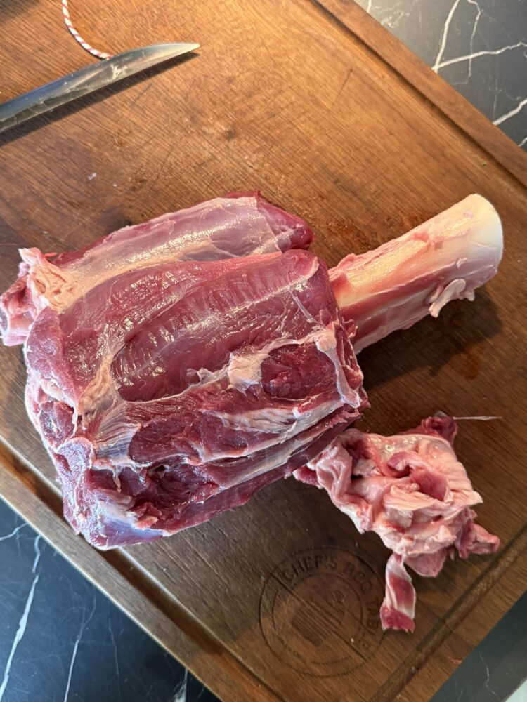 We beginnen met het schoonmaken van de beef hammer. Dit betekent dat we het dikke, stevige vlies aan de buitenkant verwijderen.
