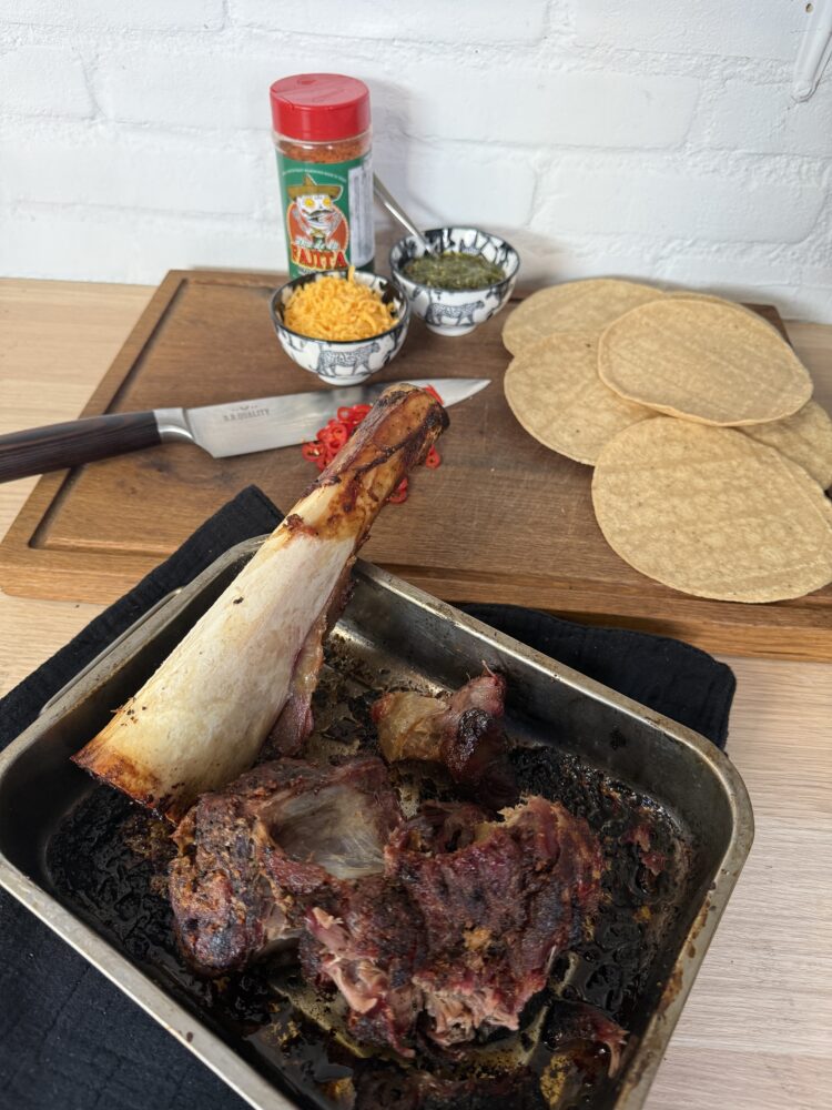 Ik serveerde de pulled beef hammer in taco’s, afgewerkt met chimichurri en rode peper. Heer-lijk!