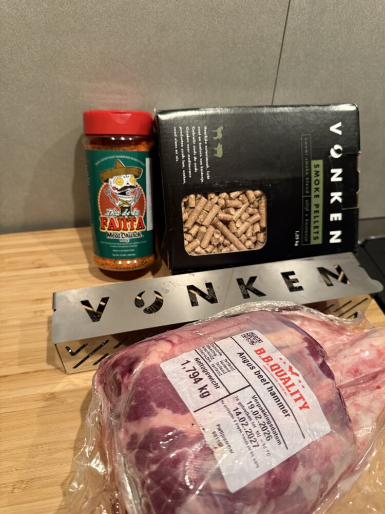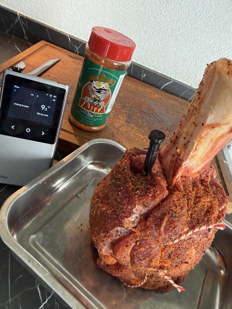 Terwijl de BBQ of oven op temperatuur komt, kun je de beef hammer kruiden met de fajita rub. Bestrooi het vlees rondom royaal met de rub en druk deze goed aan. Steek daarna een thermometer in het midden van het vlees en stel deze in op een kerntemperatuur van 70 graden Celsius.
