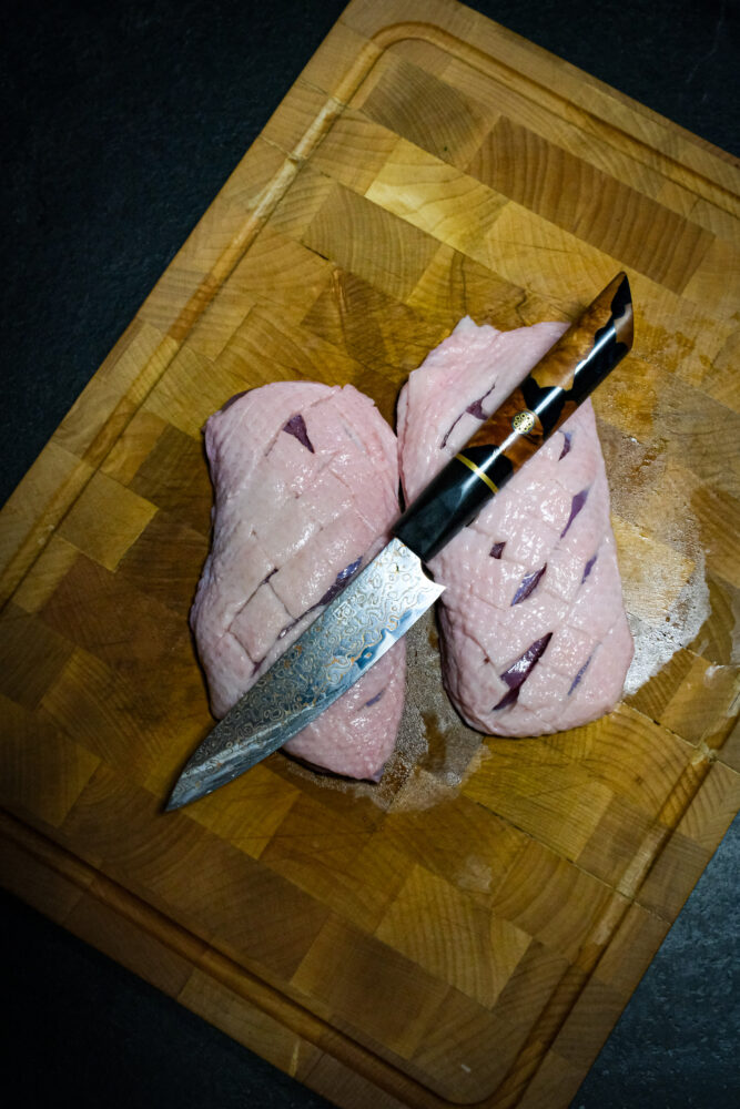 Maak de avond van tevoren de marinade door alle ingrediënten goed met elkaar te mengen. Snijd vervolgens de vetlaag van de eendenborsten kruislings in. Dit helpt de smaken beter intrekken en zorgt later voor een krokante korst.