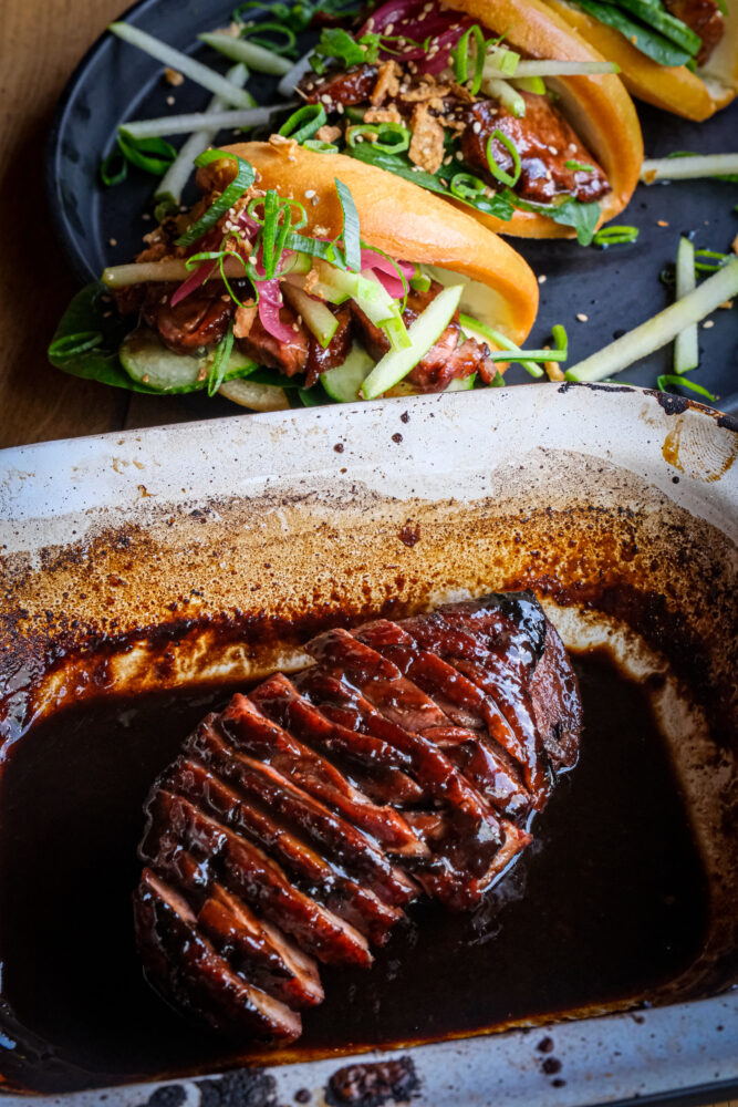 Snijd de eendenborsten in mooie, dunne plakjes en bestrijk ze licht met de overgebleven glaze voor extra glans en smaak. Serveer ze bijvoorbeeld met rijst of noedels, of, zoals ik heb gedaan, in gefrituurde bao buns met wat spinazie, komkommer, Granny Smith-appel en zoetzure ui. Eet smakelijk!!
