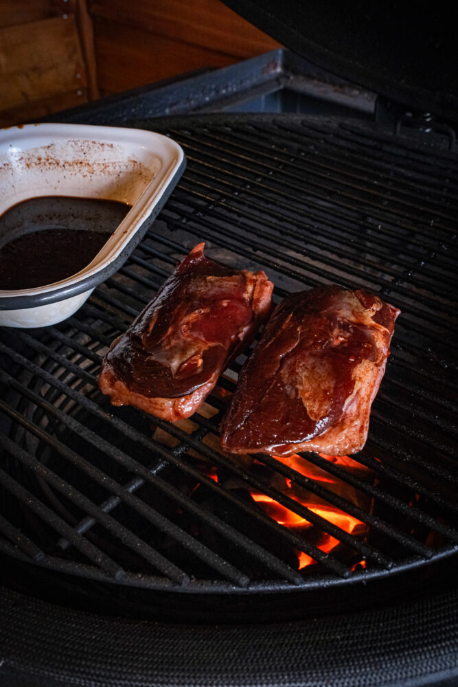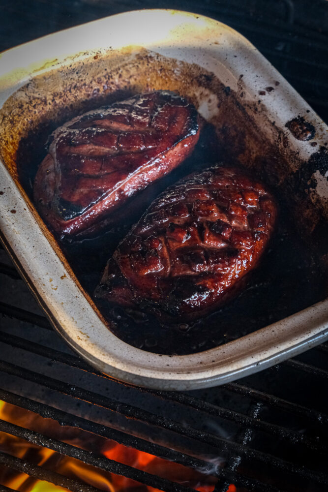 Voeg een rookblokje toe aan de kolen voor extra rooksmaak. Haal vervolgens de eendenborsten uit de marinade en leg ze met de vetkant naar beneden boven de directe hitte. Plaats het resterende deel van de marinade in een pannetje op de barbecue (ook boven directe hitte) en laat dit inkoken tot een dikke, glanzende glaze.