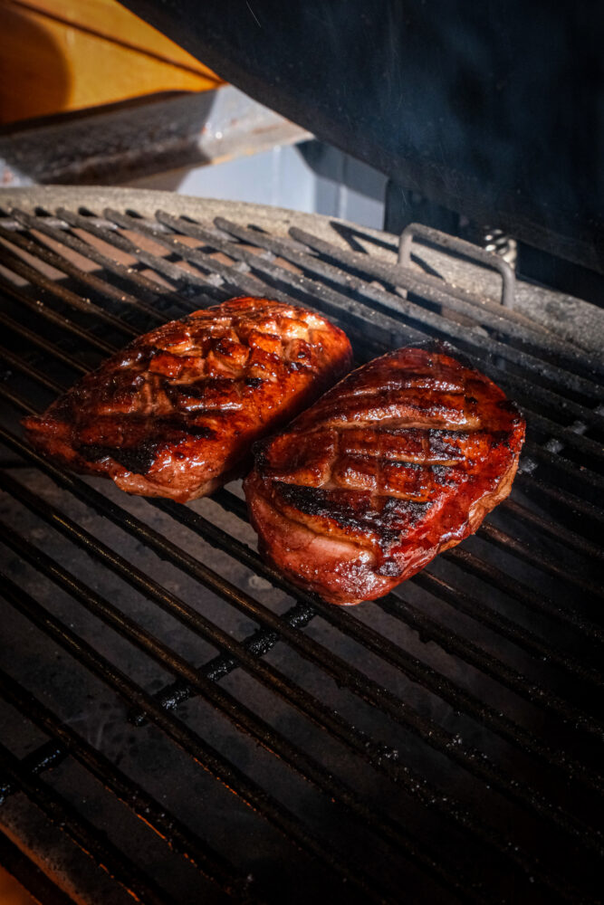 Zodra de vetkant van de eendenborst mooi krokant is, draai je de filets om en verplaats je ze naar de indirecte zijde van de barbecue. Gaar de eendenborst verder tot een kerntemperatuur van 54 graden Celsius.
