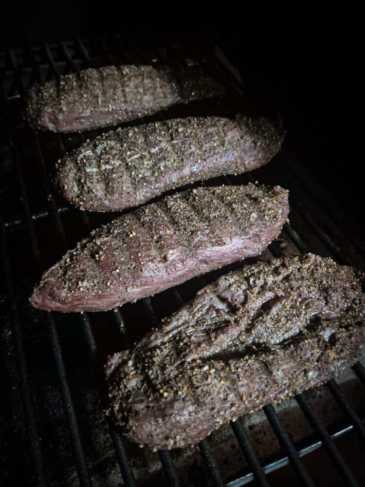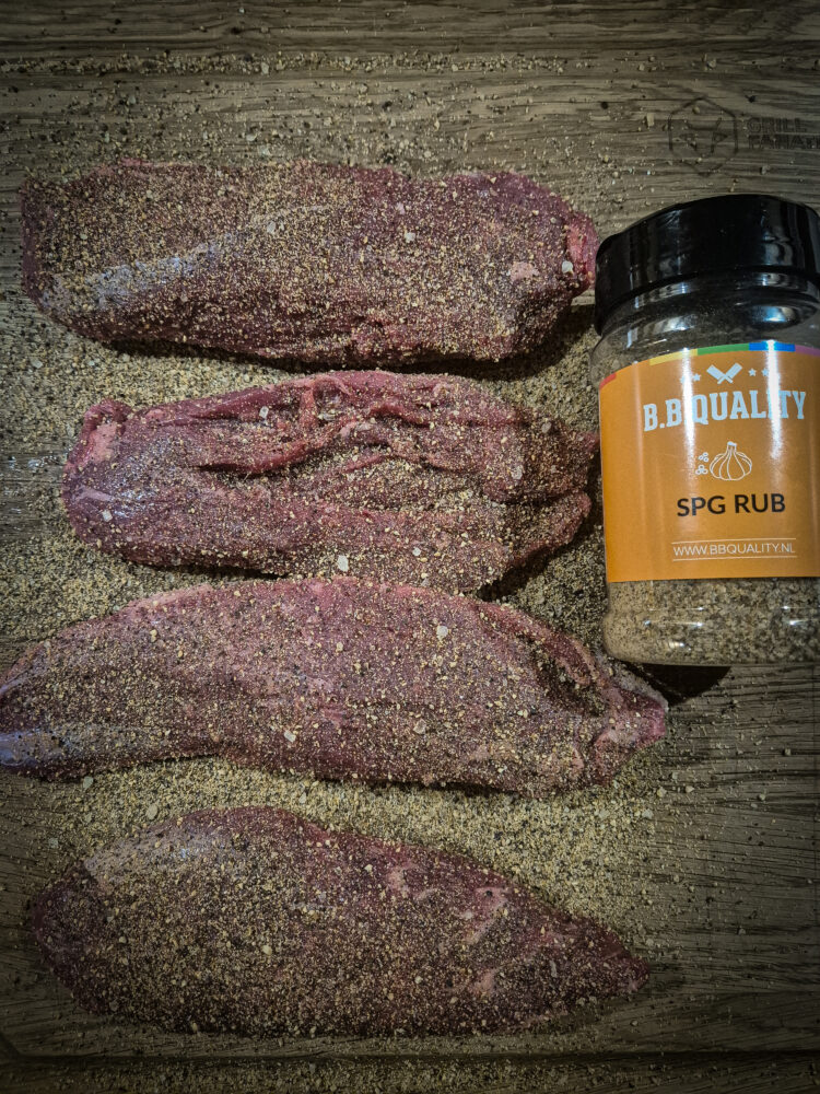 Voorzie de diamanthaasjes aan beide kanten van een lichte laag SPG rub. Leg ze op de BBQ en gaar ze tot een kerntemperatuur van 25–26 graden Celsius. Draai het vlees vervolgens om en gaar door tot 50–52 graden Celsius. Zodra deze temperatuur is bereikt, haal je de diamanthaasjes van de BBQ en laat je ze rusten onder aluminiumfolie, zodat de sappen mooi in het vlees blijven.