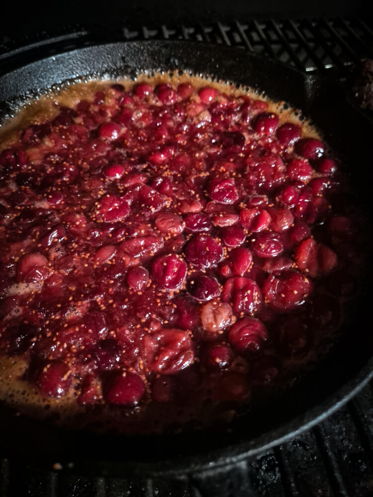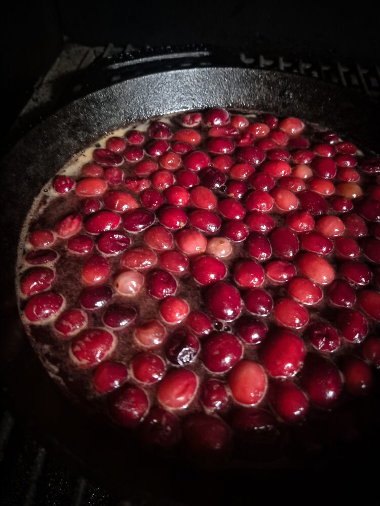 Voeg de cranberries toe aan de skillet en laat ze met rust tot ze open beginnen te springen. Voeg daarna de suiker, het water en het sap van de sinaasappels toe. Roer alles goed door en laat de saus rustig inkoken. Ga ondertussen verder met het vlees.