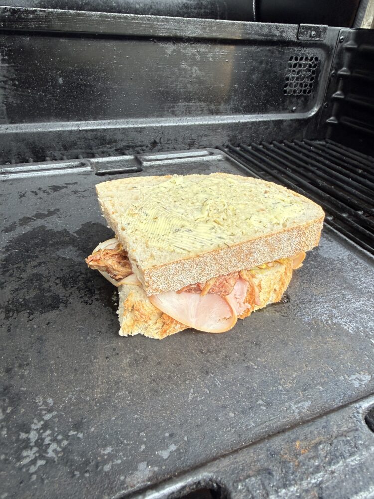 Besmeer de buitenkanten van het brood met een laagje kruidenboter, zodat de sandwich straks mooi goudbruin en knapperig wordt op de grill.
