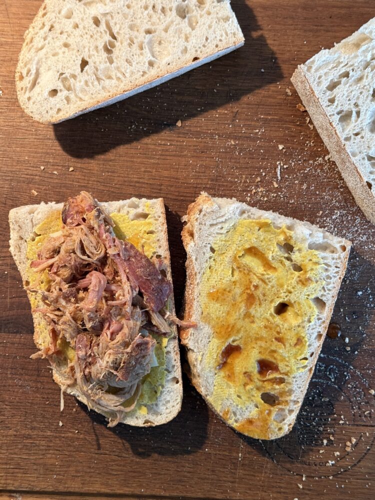 Besmeer de binnenkant van het brood met een dun laagje mosterd en vervolgens een beetje BBQ-saus. Leg er twee plakjes kaas op, gevolgd door een royale portie pulled pork. Daarbovenop komt een plak ham, twee plakjes augurk en tot slot nog twee plakjes kaas voor die extra smeuïgheid.