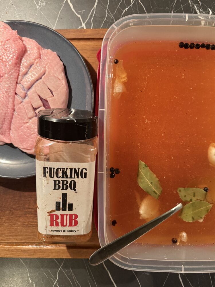 Breng één liter water aan de kook in een pan en voeg 50 gram zout, twee laurierblaadjes, twee tenen knoflook, één eetlepel Fucking BBQ Rub en enkele jeneverbessen toe. Roer goed door tot al het zout volledig is opgelost. Zet daarna het vuur uit en giet er nog één liter koud water bij. Op die manier koelt de pekel sneller af en kan de eend er eerder in. Laat de pekel vervolgens volledig afkoelen in de koelkast voordat je de eendenborstfilet toevoegt.