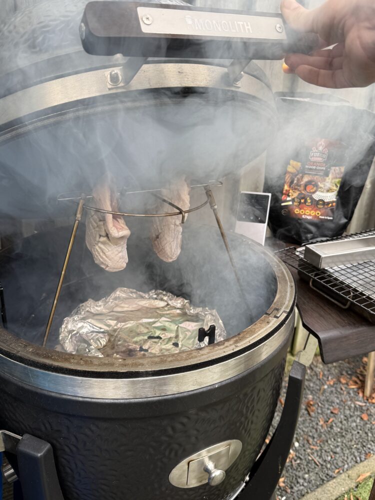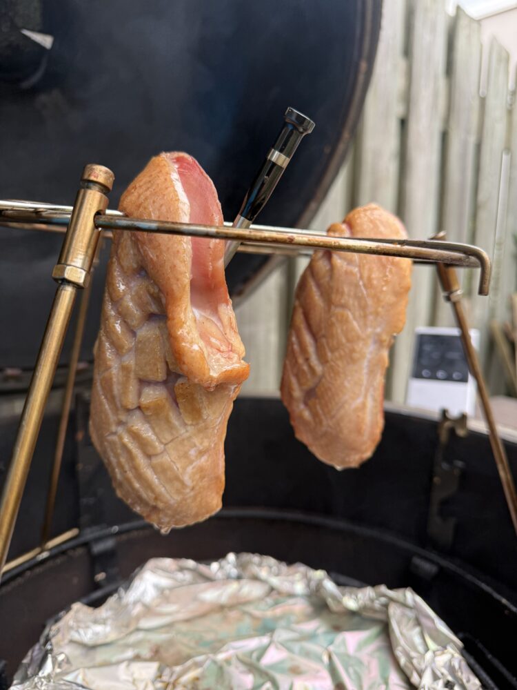 Na twaalf uur pekelen is het tijd om de eendenborst uit de pekel te halen. Spoel de filets goed af onder koud stromend water om overtollig zout te verwijderen en dep ze vervolgens zorgvuldig droog met keukenpapier. Hoe droger de eendenborst, hoe beter de rook straks aan het vlees hecht. Steek daarna de barbecue aan en bereid deze voor op een indirecte bereiding van ongeveer 90 tot 100 graden Celsius. Heb je de mogelijkheid om de eendenborsten op te hangen in de BBQ, dan is dat zeker aan te raden. Zo krijgt de rook rondom het vlees vrij spel.