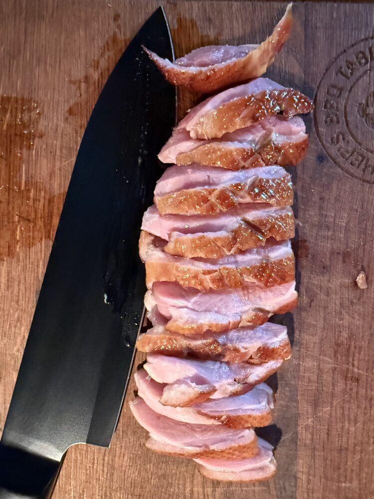 Wanneer de thermometer 55 graden aangeeft, is de eendenborst perfect gegaard: mals van binnen, met een subtiele rooksmaak aan de buitenkant. Je kunt de filets direct serveren, of ze nog even laten rusten zodat de rookaroma’s zich nog iets dieper in het vlees trekken.