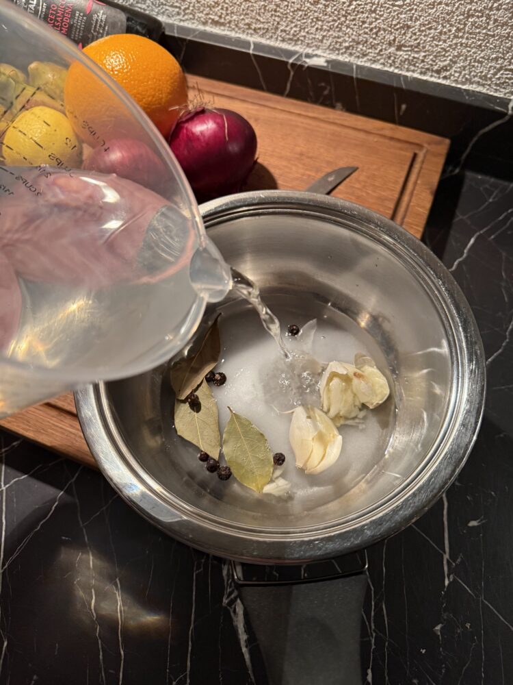 We beginnen met het maken van de pekel, de basis voor een smaakvolle en sappige eendenborst. Omdat de eend hier twaalf uur in moet rusten, maken we deze als eerste klaar.