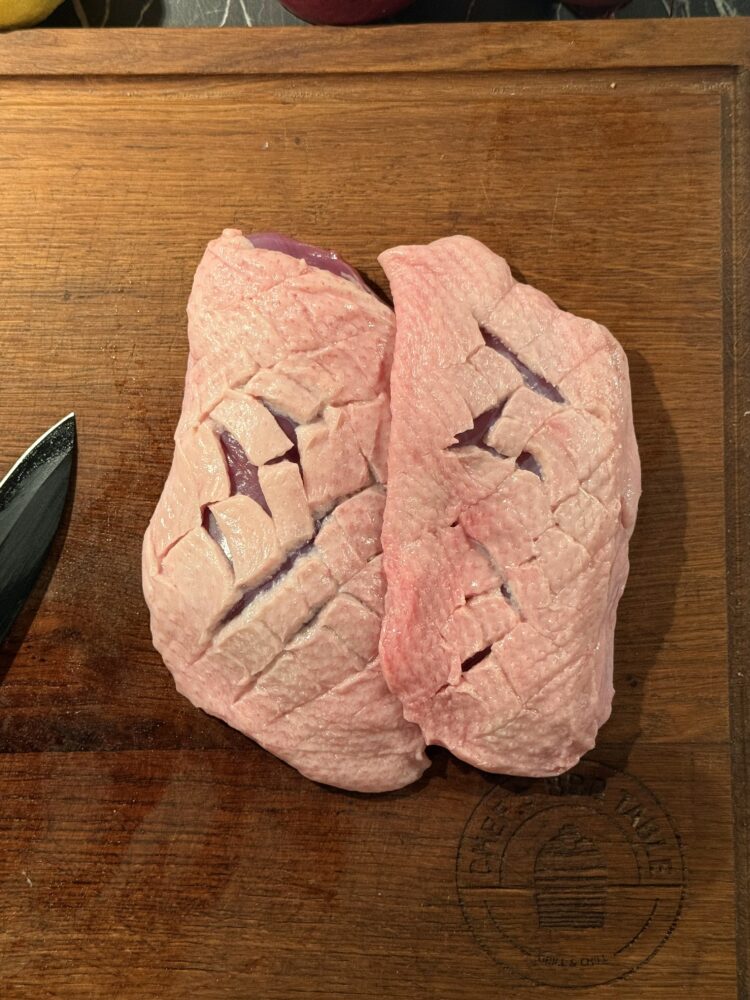 Wanneer de pekel volledig is afgekoeld, is het tijd om de eend voor te bereiden. Haal de eendenborsten uit de verpakking en dep ze droog met keukenpapier. Snijd vervolgens met een scherp mes het vet kruislings in. Let er goed op dat je alleen door het vet snijdt en niet in het vlees. Zo kan de pekel beter intrekken en blijft de eendenborst tijdens het roken mooi mals.