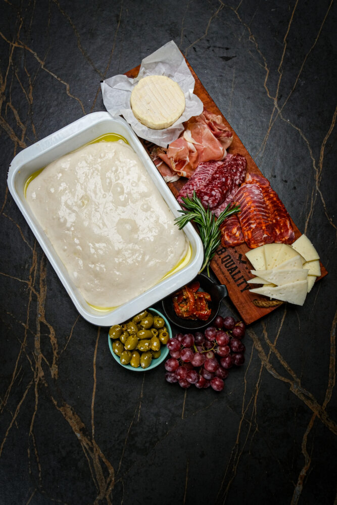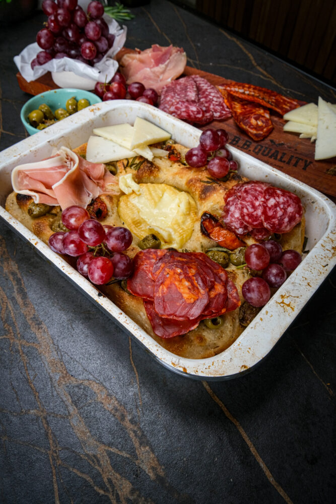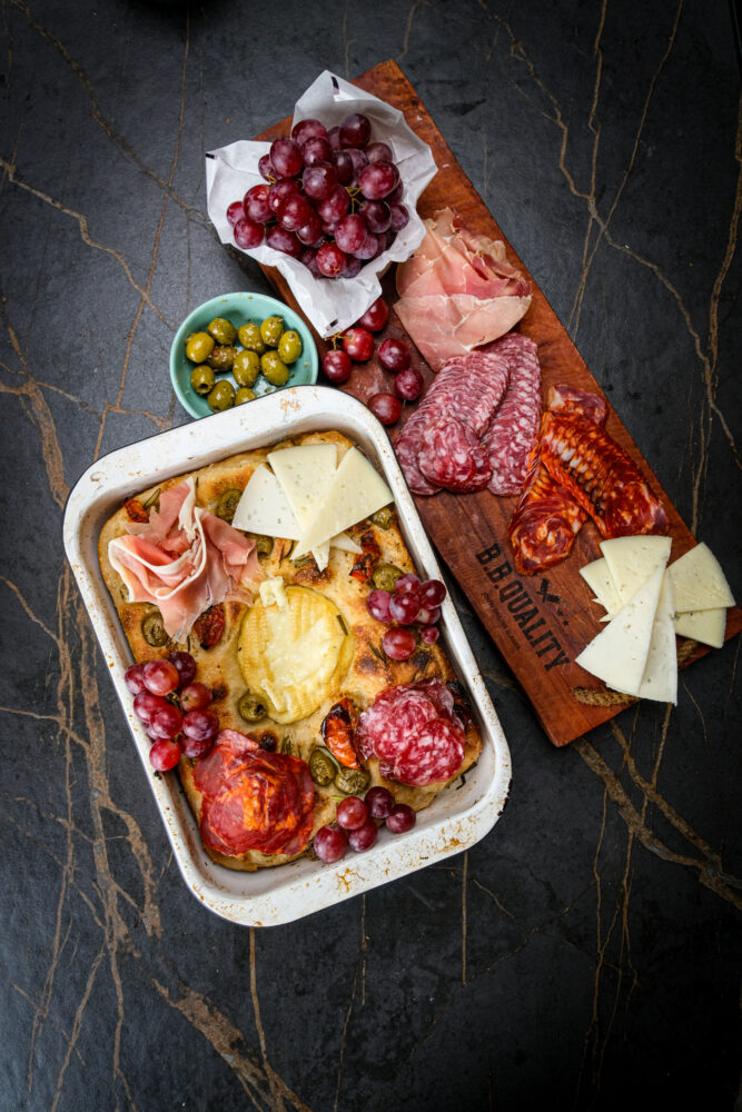Haal de focaccia van de barbecue en laat deze minimaal 5 minuten rusten voordat je hem verder opmaakt. Verdeel daarna de charcuterie, kazen en druiven over de focaccia of serveer deze ernaast.