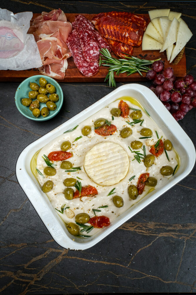 Haal het deeg 2 tot 4 uur voordat je gaat bakken uit de koelkast (korter bij warm weer). Laat het op temperatuur komen en druk het indien nodig verder uit naar de randen van de schaal. Plaats een hele camembert in het midden van het deeg en verdeel de olijven en zongedroogde tomaten erover. Laat dit afgedekt nog 2 tot 4 uur rusten buiten de koelkast.