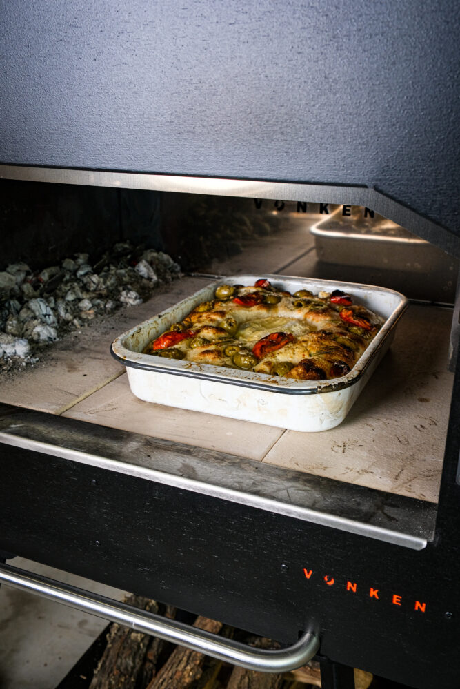 Bak de focaccia op de barbecue (of in de Vonken/pizza oven) en controleer na ongeveer 15 minuten. Bak verder tot de bovenkant goudbruin en licht krokant is.