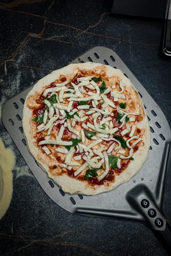 Leg een royale hoeveelheid semola op je werkbank, op de plek waar je de pizza gaat vormen. Bestrooi ook de pizzabol en je pizzaschep licht met semola, zodat niets blijft plakken.