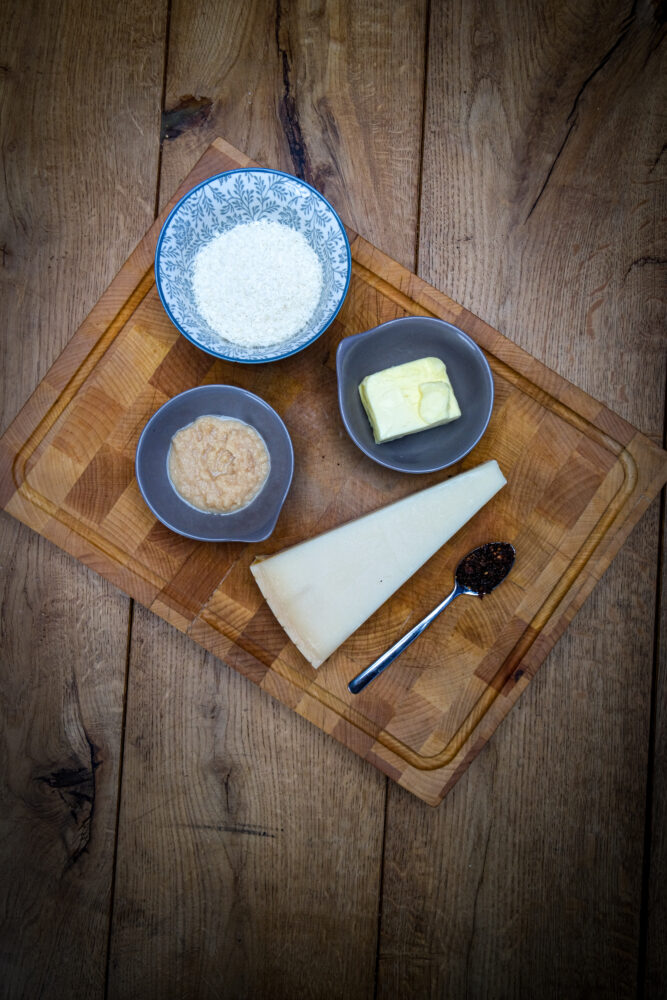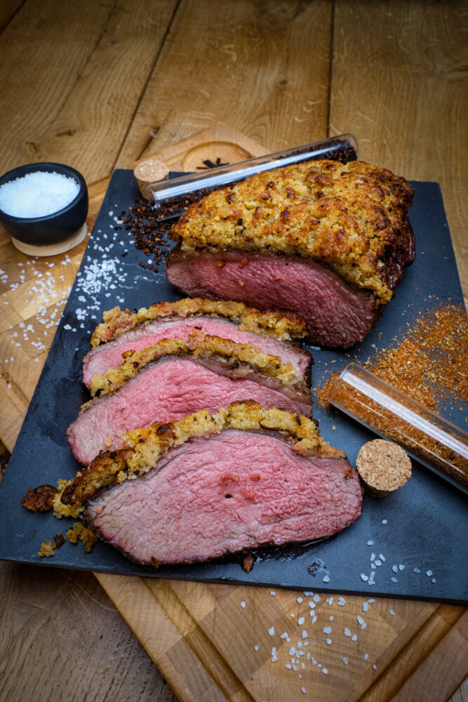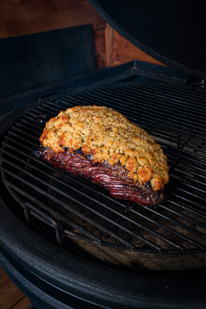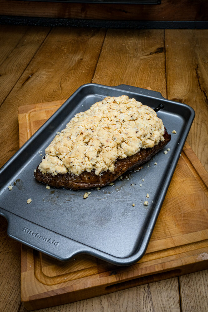 Rasp ondertussen de kaas en meng deze met de knoflook, panko, chipotle chili en boter tot een smeuïg mengsel. Haal de picanha van de barbecue zodra deze rondom mooi is gegrild en verdeel het korstmengsel gelijkmatig over de vetkant.