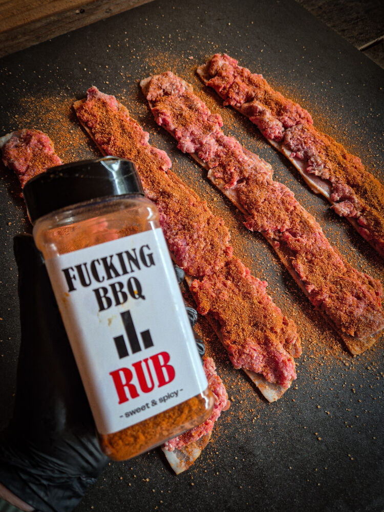 Leg 2 plakken ontbijtspek in de lengte met een klein beetje overlap achter elkaar. Druk over de hele lengte ongeveer 125 gram gehakt op het spek en bestrooi dit royaal met de gekozen rub.