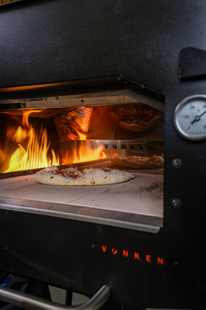 Schuif de pizza in de oven of BBQ en bak hem tot de bodem goudbruin en krokant is. In een pizzaoven duurt dit ongeveer 2 minuten, in een BBQ of gewone oven iets langer.
