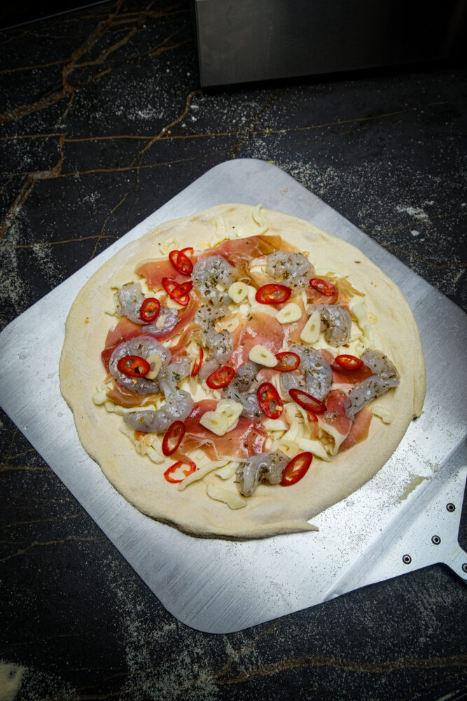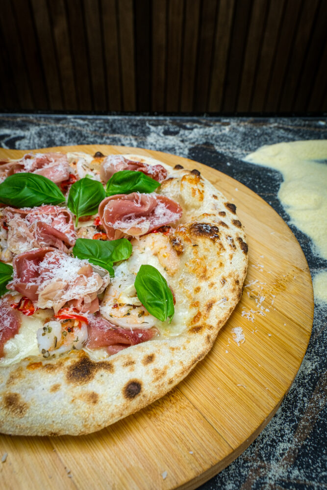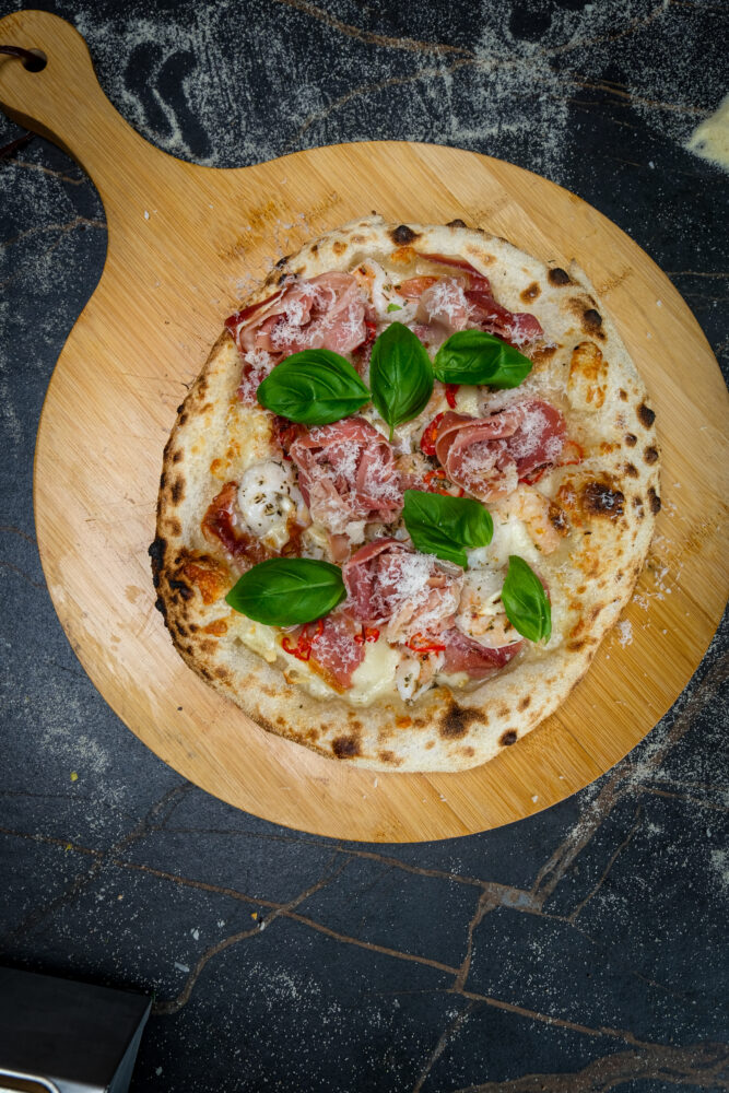 Deze surf & turf pizza brengt het beste van land en zee samen op één bodem. Sappige gemarineerde garnalen en hartige serranoham worden gecombineerd met romige fior di latte, knoflook en een subtiele kick van chilipeper. Afgewerkt met pecorino romano en verse basilicum ontstaat een pizza met een perfecte balans tussen fris, pittig en hartig.