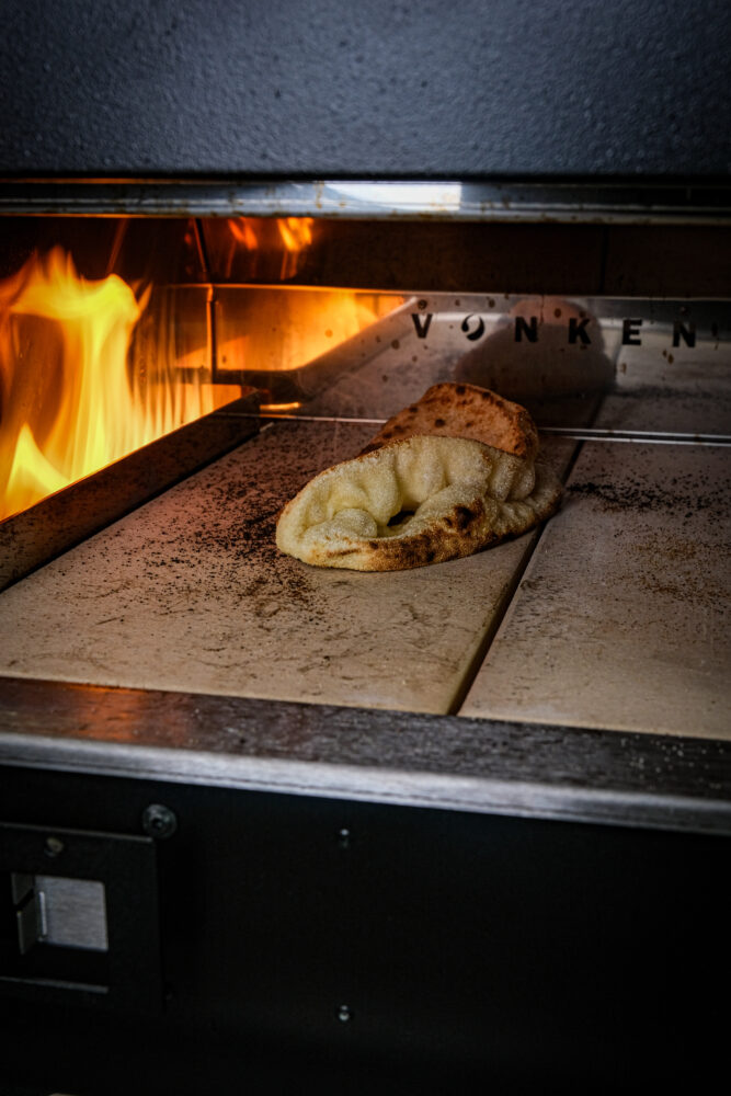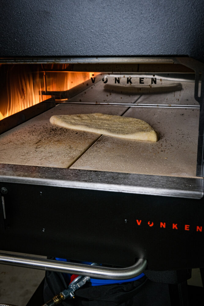 Schuif de pizzasandwich voorzichtig in de oven, barbecue of pizzaoven. De baktijd hangt af van de temperatuur: hoe heter, hoe sneller hij klaar is. Controleer tussendoor en draai indien nodig voor een gelijkmatige garing.