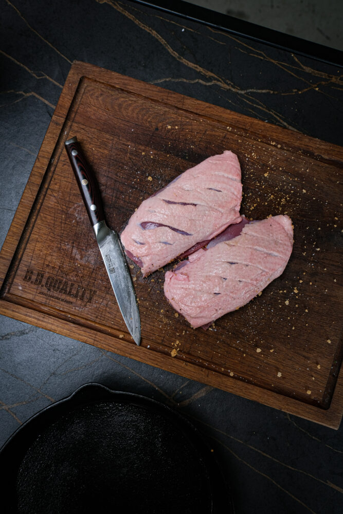 Snijd het overtollige vet van de eendenborst en kerf het vet kruislings in, zonder in het vlees te snijden. Breng de vleeskant op smaak met SPG-rub en bestrooi de vetkant met zout.