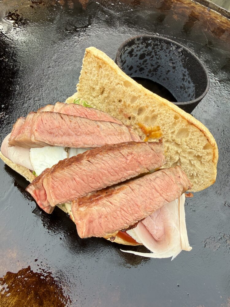De prachtige Ribeye El Rancho verdient een gerecht met karakter, en dat vinden we in Uruguay. De Chivito is daar een iconische, traditionele sandwich. In deze variant wordt hij royaal belegd met sappige ribeye, verse tomaat, gesmolten mozzarella, krokant gebakken bacon, gekookte ham, een gebakken ei, gebakken ui en knapperige sla.