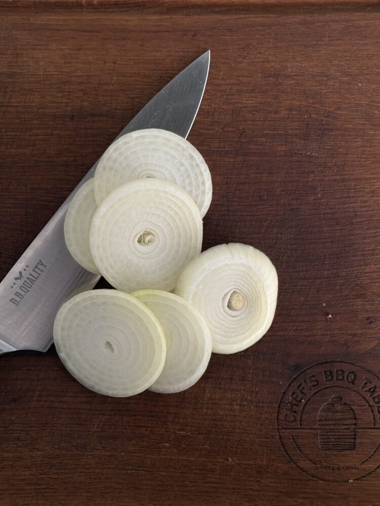 We beginnen met het voorbereiden van alle ingrediënten, zodat we straks direct kunnen beginnen met het bouwen van deze heerlijke sandwiches. Maak de ui schoon en snijd deze in ringen. Snijd de tomaat en mozzarella in plakken en zet alles apart tot gebruik.