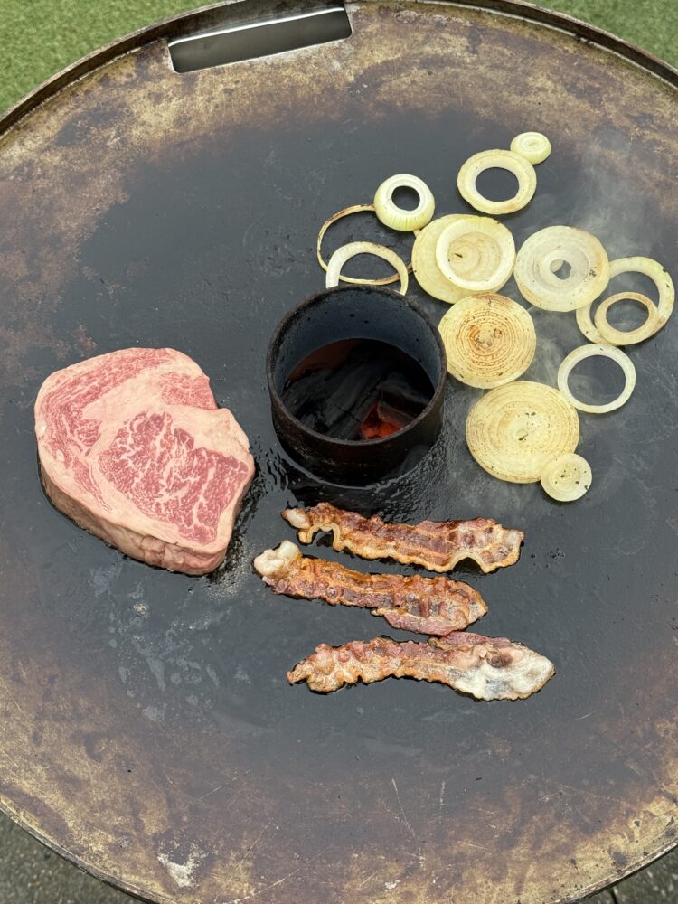 Zodra de plancha of skillet goed heet is, kunnen we beginnen met bakken. Start met de bacon en bak deze rustig uit tot hij mooi krokant is. Haal de bacon van de plancha en leg apart.
