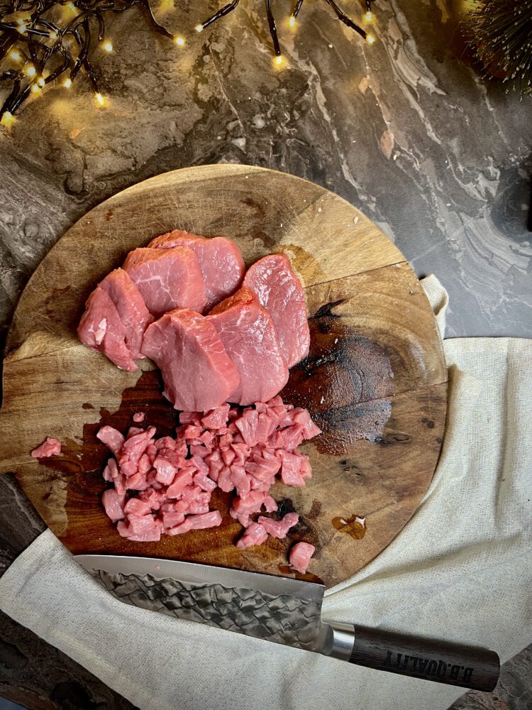 Snijd de kalfsmuis in dunne plakjes en vervolgens in zeer fijne blokjes (2–3 mm). Neem hier even de tijd voor, dit maakt echt het verschil in mondgevoel.