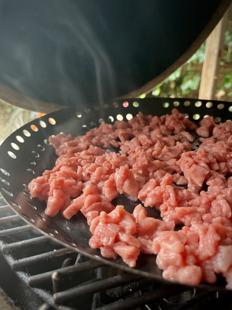 Verdeel het fijngesneden kalfsvlees over een geperforeerde schaal (of een fijn rooster) zodat de rook er goed bij kan.