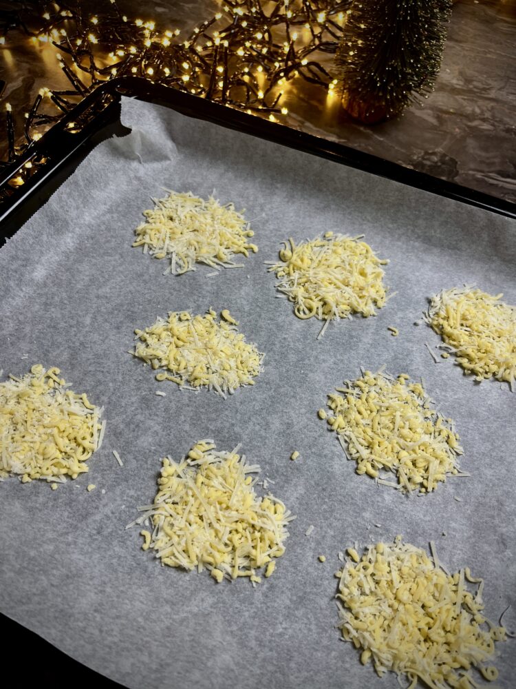 Maak hoopjes van de kaas: strooi per koekje twee theelepels kaas op het bakpapier. Spreid dit een beetje uit tot rondjes van ongeveer 7 cm doorsnede.