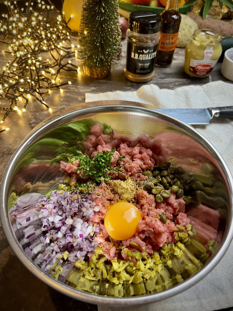 Meng het gerookte kalfsvlees in een kom met 1 eierdooier, de kappertjes, rode ui, augurk, Dijonmosterd, Worcestersaus, peterselie en de BBQuality SPG rub.
